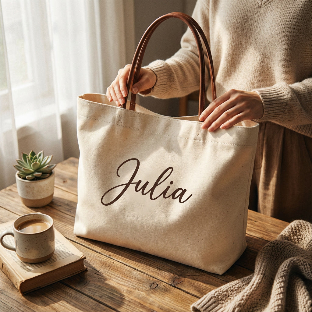 Julia grabs her canvas tote for every outing — stylish, simple, and always ready for her day.